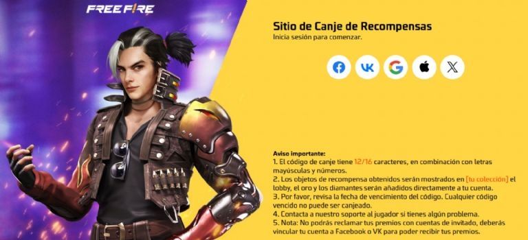 - Para poder realizar el proceso de canje necesitarás iniciar tu sesión en tu cuenta de Free Fire desde alguna de las siguientes opciones: Facebook, Google, VK, Twitter, Apple.