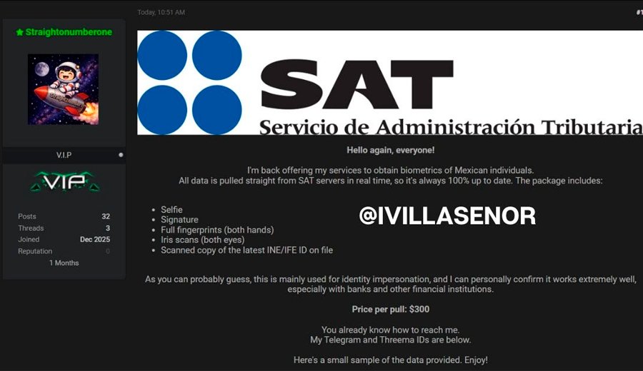 - Venta en foros de ciberdelincuencia: el periodista mexicano Ignacio Gómez Villaseñor expuso en redes sociales a un usuario identificado como “Straigtonumberone” quien afirma tener acceso a los servidores del SAT y ofrece paquetes de identidad con huellas, iris, firma, foto y RFC. Sus consultas tienen un costo de $300 USD e incluyen datos biométricos con alta nitidez.