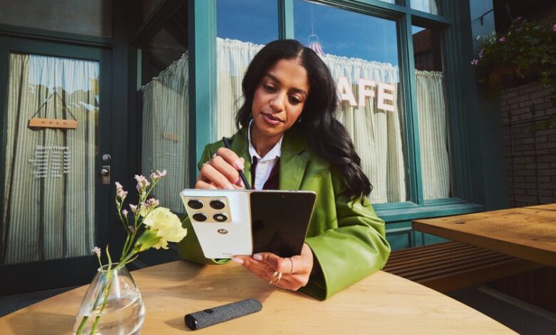 El razr fold se ha mostrado en dos colores inspirados en la paleta Pantone: Blackened Blue y Lily White. Las imágenes también sugieren compatibilidad con el nuevo Moto Pen Ultra, un stylus que aparece junto al dispositivo en materiales promocionales.