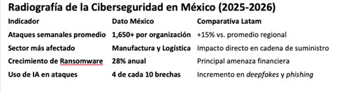 Respecto a México, se revela un cambio de paradigma que va más allá de la tecnología: es un riesgo crítico para la continuidad de negocio y el Nearshoring. Mientras la digitalización avanza, la superficie de exposición en las empresas mexicanas se ha vuelto inmanejable. Según el reporte, México no solo es el blanco principal de la región, sino que la sofisticación de los ataques impulsados por IA está dejando obsoletas las defensas tradicionales.